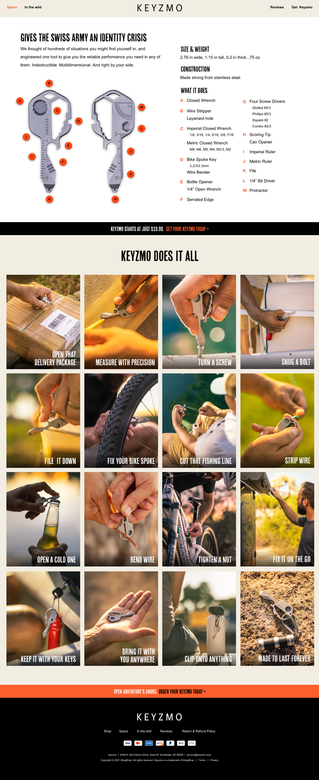 Keyzmo is a 16 function multitool designed to do everything from cutting a fishing line to opening a delivery package. The team approached us to craft a brand narrative that appeals to their audience’s sense of adventure, however they choose to define it.