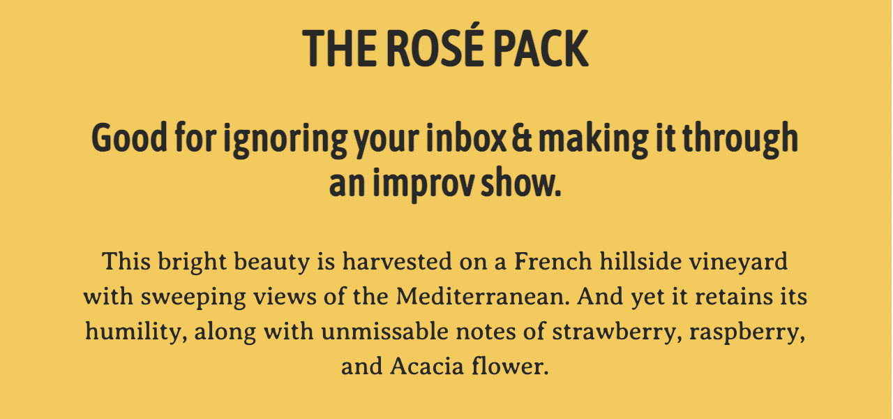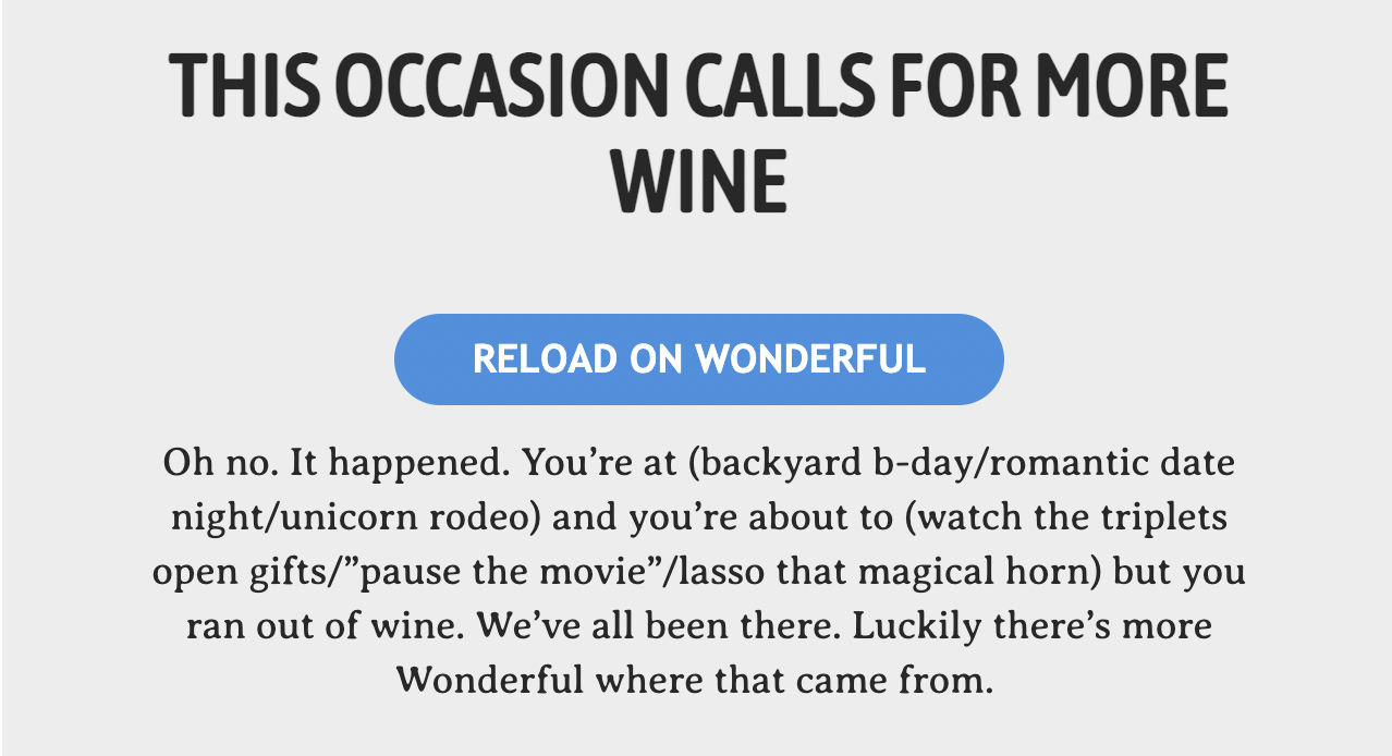 Just some fun examples of product copy for emails and website updates at Wonderful Wine Co., a whimsical brand selling better-for-you natural wines.